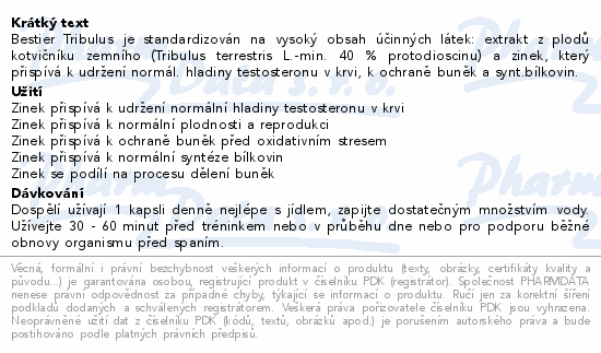Bestier Tribulus je standardizován na vysoký obsah účinných látek: extrakt z plodů kotvičníku zemního (Tribulus terrestris L.-min. 40 % protodioscinu) a zinek, který přispívá k udržení normál. hladiny testosteronu v krvi, k ochraně buněk a synt.bílkovin.