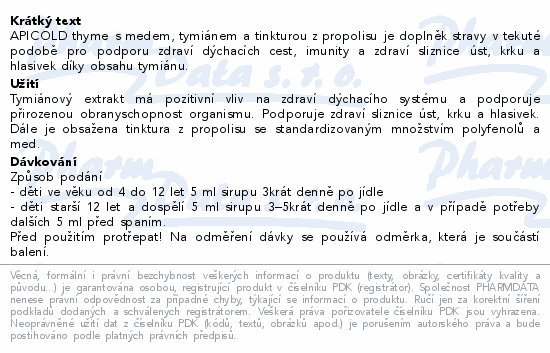 APICOLD thyme s medem, tymiánem a tinkturou z propolisu je doplněk stravy v tekuté podobě pro podporu zdraví dýchacích cest, imunity a zdraví sliznice úst, krku a hlasivek díky obsahu tymiánu.