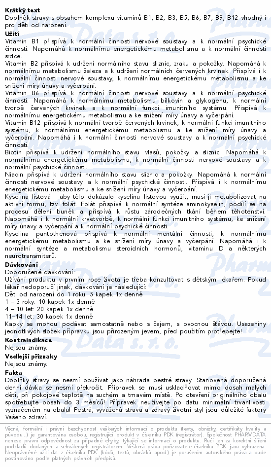 Doplněk stravy s obsahem komplexu vitamínů B1, B2, B3, B5, B6, B7, B9, B12 vhodný i pro děti od narození.