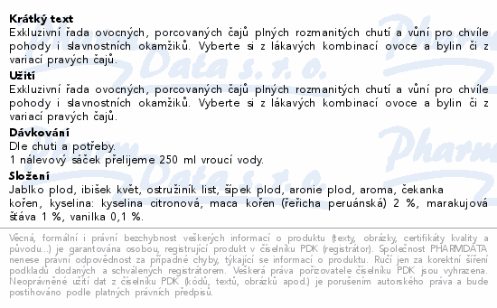 Exkluzivní řada ovocných, porcovaných čajů plných rozmanitých chutí a vůní pro chvíle pohody i slavnostních okamžiků. Vyberte si z lákavých kombinací ovoce a bylin či z variací pravých čajů.