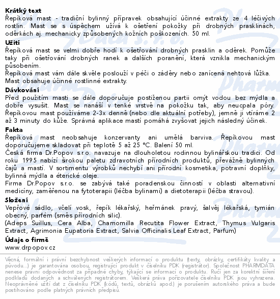 Řepíková mast - tradiční bylinný přípravek obsahující účinné extrakty ze 4 léčivých rostlin. Mast se s úspěchem užívá k ošetření pokožky při drobných prasklinách, oděrkách aj. mechanicky způsobených kožních poškozeních. 50 ml.