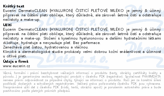Eucerin DermatoCLEAN [HYALURON] ČISTICÍ PLEŤOVÉ MLÉKO je jemný & účinný přípravek na čištění pleti obličeje, který důkladně, ale zároveň šetrně čistí a odstraňuje nečistoty a make-up.