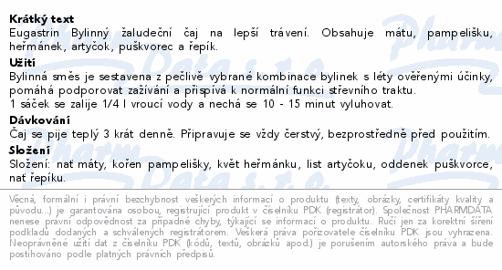 Eugastrin Bylinný žaludeční čaj na lepší trávení. Obsahuje mátu, pampelišku, heřmánek, artyčok, puškvorec a řepík.