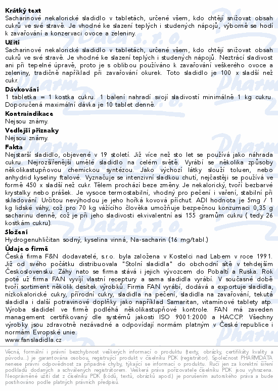 Sacharinové nekalorické sladidlo v tabletách, určené všem, kdo chtějí snižovat obsah cukrů ve své stravě. Je vhodné ke slazení teplých i studených nápojů, výborně se hodí k zavařování a konzervaci ovoce a zeleniny.