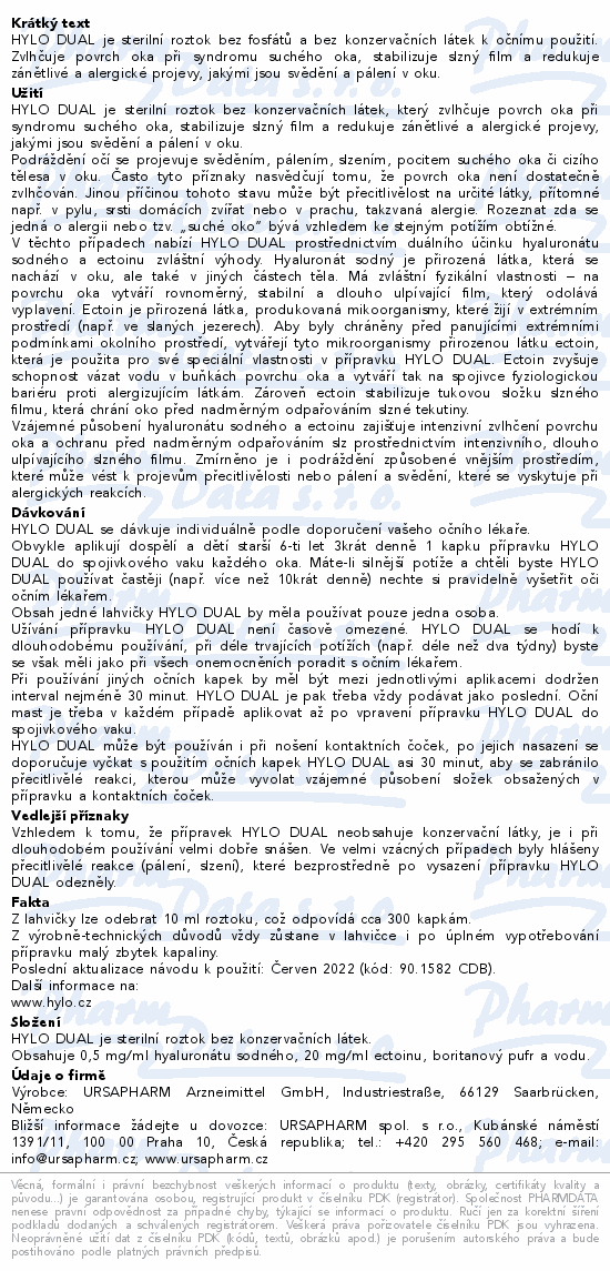 HYLO DUAL je sterilní roztok bez fosfátů a bez konzervačních látek k očnímu použití. Zvlhčuje povrch oka při syndromu suchého oka, stabilizuje slzný film a redukuje zánětlivé a alergické projevy, jakými jsou svědění a pálení v oku.