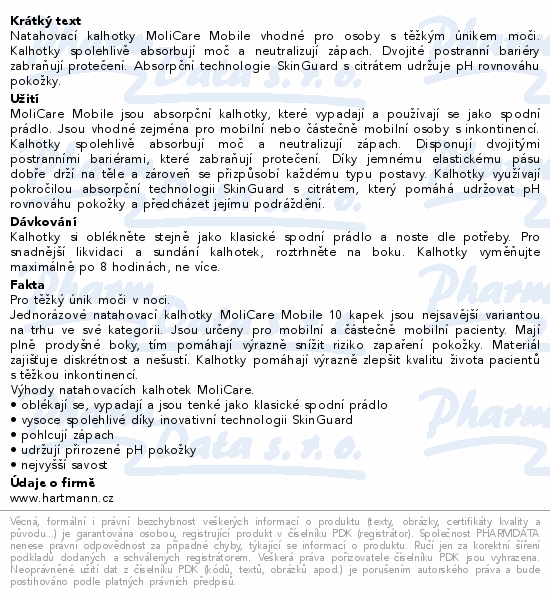 Natahovací kalhotky MoliCare Mobile vhodné pro osoby s těžkým únikem moči. Kalhotky spolehlivě absorbují moč a neutralizují zápach. Dvojité postranní bariéry zabraňují protečení. Absorpční technologie SkinGuard s citrátem udržuje pH rovnováhu pokožky.