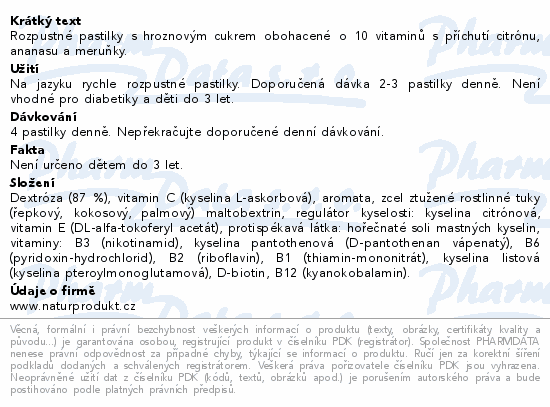 Rozpustné pastilky s hroznovým cukrem obohacené o 10 vitaminů s příchutí citrónu, ananasu a meruňky.