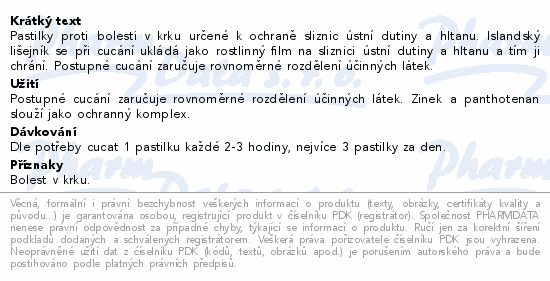 Pastilky proti bolesti v krku určené k ochraně sliznic ústní dutiny a hltanu. Islandský lišejník se při cucání ukládá jako rostlinný film na sliznici ústní dutiny a hltanu a tím ji chrání. Postupné cucání zaručuje rovnoměrné rozdělení účinných látek.