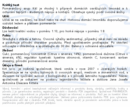 Pomerančový sirup Kitl je vhodný k přípravě domácích osvěžujících limonád a k ochucení teplých i studených nápojů a koktejlů. Obsahuje vysoký podíl ovocné složky.