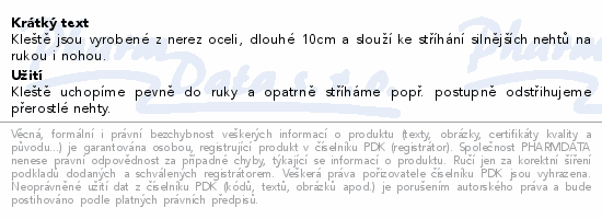 Kleště jsou vyrobené z nerez oceli, dlouhé 10cm a slouží ke stříhání silnějších nehtů na rukou i nohou.