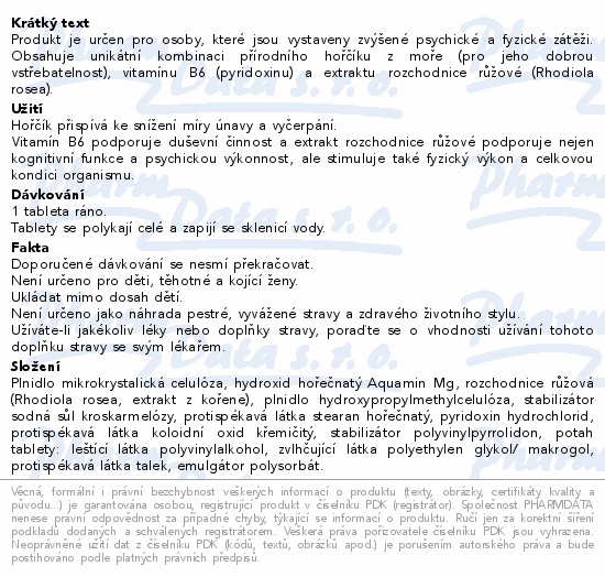 Produkt je určen pro osoby, které jsou vystaveny zvýšené psychické a fyzické zátěži. Obsahuje unikátní kombinaci přírodního hořčíku z moře (pro jeho dobrou vstřebatelnost), vitamínu B6 (pyridoxinu) a extraktu rozchodnice růžové (Rhodiola rosea).