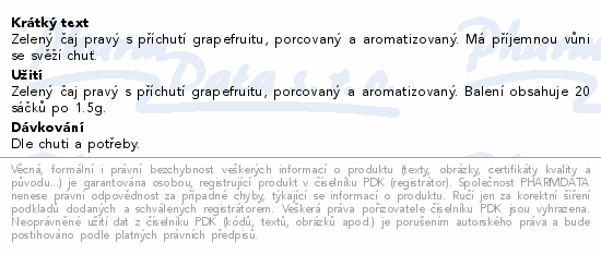 Zelený čaj pravý s příchutí grapefruitu, porcovaný a aromatizovaný. Má příjemnou vůni se svěží chuť.