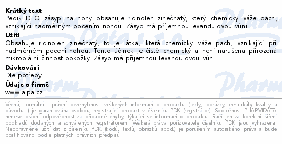 Pedik DEO zásyp na nohy obsahuje ricinolen zinečnatý, který chemicky váže pach, vznikající nadměrným pocením nohou. Zásyp má příjemnou levandulovou vůni.