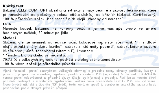 Balzám BELLY COMFORT obsahující extrakty z máty peprné a zázvoru lékařského, které při vmasírování do pokožky v oblasti bříška ulehčují od břišních těžkostí. Certifikovaný, 100 % přírodních složek, bez esenciálních olejů. Vhodný od narození.