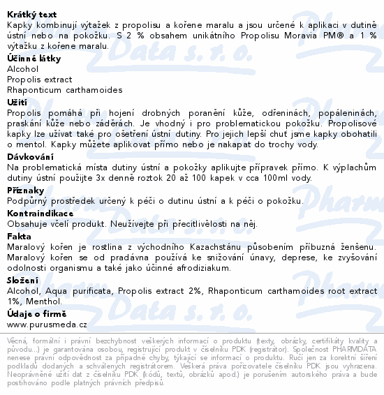 Kapky kombinují výtažek z propolisu a kořene maralu a jsou určené k aplikaci v dutině ústní nebo na pokožku. S 2 % obsahem unikátního Propolisu Moravia PM® a 1 % výtažku z kořene maralu.
