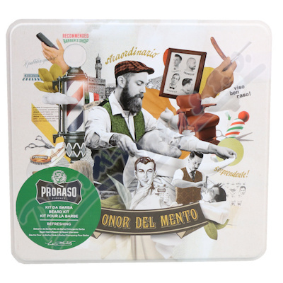 Klasická plechová krabička, pořádně fortelná, ještě hezčeji pomalovaná. V ní kompletní sada přípravků na plnovous. Vyrobilo je Proraso z Itálie. Tyto jsou z nejoblíbenější řady Refreshing s vůní eukalyptu.