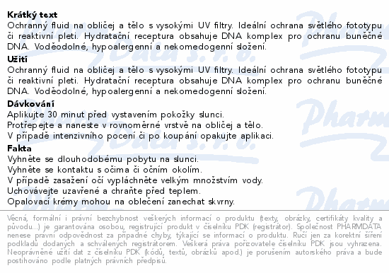 Ochranný fluid na obličej a tělo s vysokými UV filtry. Ideální ochrana světlého fototypu či reaktivní pleti. Hydratační receptura obsahuje DNA komplex pro ochranu buněčné DNA. Voděodolné, hypoalergenní a nekomedogenní složení.