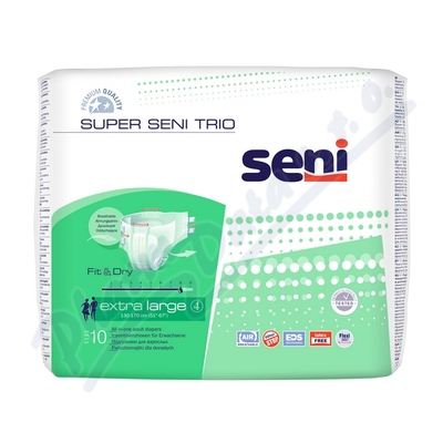 Prodyšné plenkové kalhotky Super Seni Trio Large pro velmi těžkou inkontinenci se savostí 3000ml, obvod pasu 100-150cm, 10ks. Dvojité savé jádro zajišťuje větší pocit sucha a vnitřní boční záhyby předcházejí úniku moči.