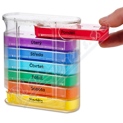Patrový dávkovač léků se zásuvnými políčky pro každý den v týdnu, přehledně popsaný pro snadnou orientaci. Denní dávkovač je rozdělený na 4 části: Ráno-Poledne-Večer-Noc a lze jej použít i samostatně.