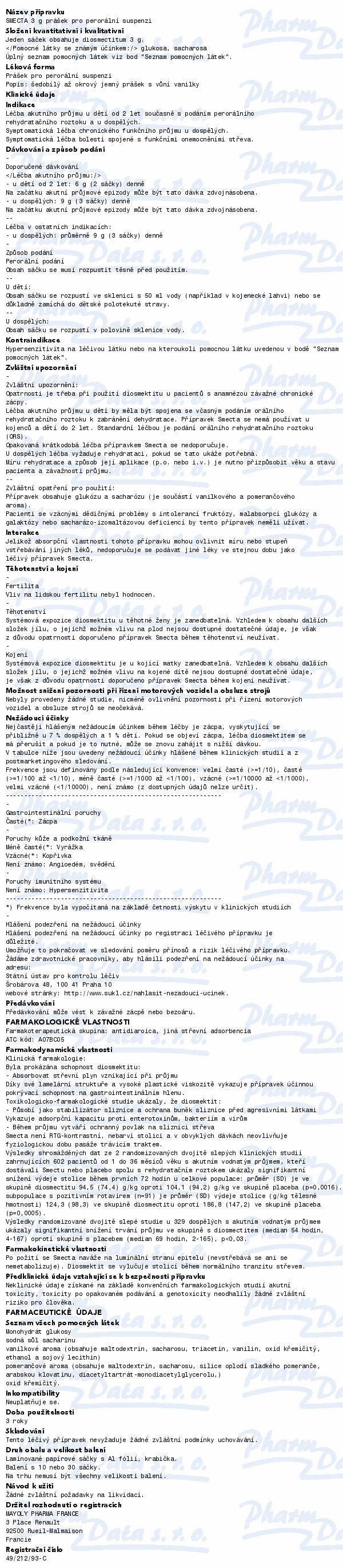 Smecta je přírodní čištěný jíl s vysokou vazebnou kapacitou, jenž je schopen se vázat s hlenem sliznice zažívacího traktu a zvyšuje tak jeho kvalitu a množství. Touto cestou chrání sliznici proti infekci a škodlivým látkám a umožňuje rychlejší uzdravení. Čtěte pozorně příbalový leták.