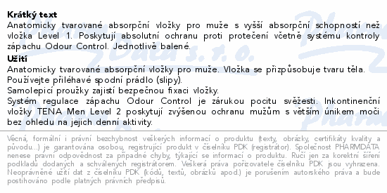 Anatomicky tvarované absorpční vložky pro muže s vyšší absorpční schopností než vložka Level 1. Poskytují absolutní ochranu proti protečení včetně systému kontroly zápachu Odour Control. Jednotlivě balené.