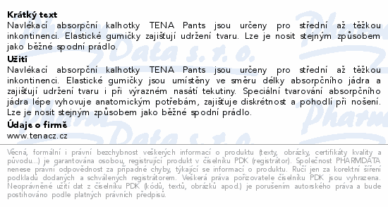 Navlékací absorpční kalhotky TENA Pants jsou určeny pro střední až těžkou inkontinenci. Elastické gumičky zajišťují udržení tvaru. Lze je nosit stejným způsobem jako běžné spodní prádlo.