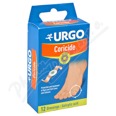 URGO Coricide jsou jednotlivě balené náplasti na místní ošetření tvrdých a měkkých kuřích ok a mozolů. Kyselina salicylová působí na zatvrdliny - ochranný kroužek je měkký a zabraňuje tření - pomocí lepící vrstvy se udržuje náplast na místě.