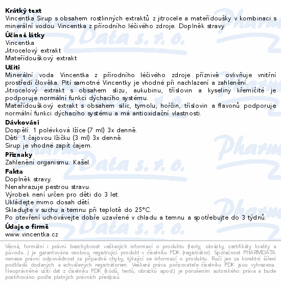 Vincentka Sirup s obsahem rostlinných extraktů z jitrocele a mateřídoušky v kombinaci s minerální vodou Vincentka z přírodního léčivého zdroje. Doplněk stravy.