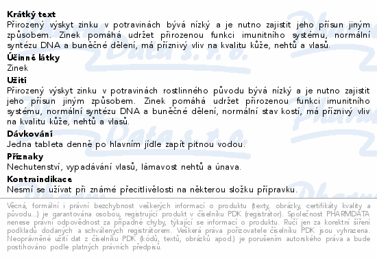 Přirozený výskyt zinku v potravinách bývá nízký a je nutno zajistit jeho přísun jiným způsobem. Zinek pomáhá udržet přirozenou funkci imunitního systému, normální syntézu DNA a buněčné dělení, má příznivý vliv na kvalitu kůže, nehtů a vlasů.